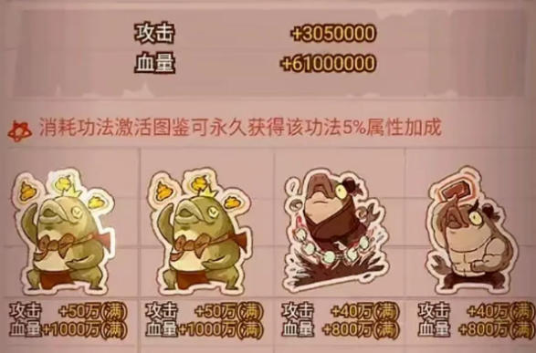 已激活图鉴的属性:功法图鉴中已解锁的属性会完整保留到下赛季,但仅继承该功法属性的5%,且不同功法的图鉴属性可叠加(同种功法仅算最高值)。因此无需执着于“双满攻血卡”,这类卡溢价高、性价比低,不如多收集珍至尊卡激活更多图鉴,叠加5%属性的长期收益更划算。目前功法图鉴最高可提供+305万攻击、+6100万血量的总加成,是不可忽视的属性来源。