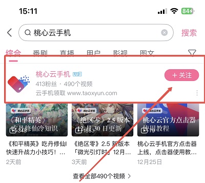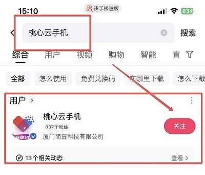 1.关注“桃心云手机”抖音/快手/B站官方号(任一个平台)。在抖音/快手/B站搜索“桃心云手机”,关注官方账号。